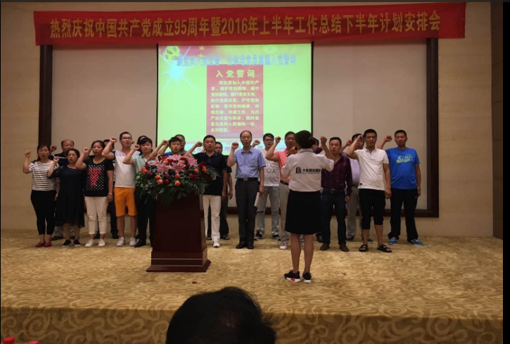 隨著一曲大合唱《沒(méi)有共產(chǎn)黨就沒(méi)有新中國(guó)》,拉開(kāi)了會(huì)議的序幕。在中國(guó)共產(chǎn)黨95周年華誕之際,熱烈祝賀我們黨永葆青春!我們的國(guó)家繁榮昌盛!公司黨委組織了新黨員宣誓,重溫了入黨誓詞,充分表達(dá)了對(duì)我黨的熱愛(ài)之情。