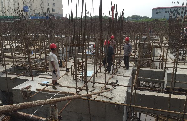 現(xiàn)場指揮部總指揮謝總工帶我們參觀了現(xiàn)場并大概介紹了各個棟號施工進(jìn)度等方面的情況。我們首先進(jìn)入16#樓施工現(xiàn)場,該棟號的項目經(jīng)理徐斌親自現(xiàn)場督促,施工現(xiàn)場緊鑼密鼓的進(jìn)行基礎(chǔ)承臺柱墻的鋼筋綁扎工作。剛剛完成的現(xiàn)澆混凝土承臺及承臺梁整體觀感好,整潔干凈、規(guī)范美觀。據(jù)謝總工介紹施工人員在混凝土澆筑時,先攤平振搗密實,然后用抹子抹平,緊接著再用掃帚在已抹好的面層上輕輕掃一遍,再用薄膜覆蓋住才能達(dá)到好的效果。承臺上正在綁扎鋼筋的墻柱,每個樣板上都張貼著相應(yīng)的構(gòu)件尺寸及鋼筋信息,便于檢查核對和施工操作,體現(xiàn)出該工程現(xiàn)場施工人員嚴(yán)謹(jǐn)認(rèn)真的工作態(tài)度。