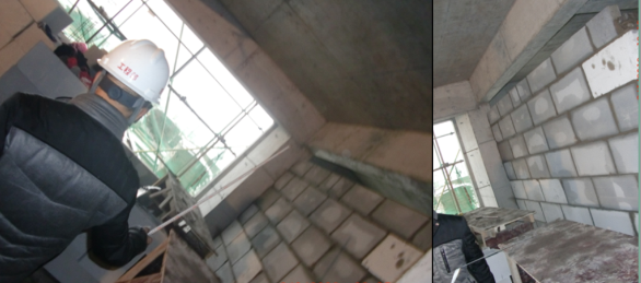 邁入三樓,王工更是拿出尺子,用精細的數(shù)據(jù)去檢驗工程的品質,他仔細測量了磚砌體頂部斜砌留置位置的大小,角度,認真向大家介紹了磚砌體施工要求以及不規(guī)范施工帶來的后果,并對16號樓規(guī)范的磚砌體作業(yè)予以高度評價,16號樓磚砌體灰縫均勻、順直、密實,基礎處理較好;拖墻筋植筋合規(guī);頂部斜砌留置合規(guī);墻體觀感度良好,整體質量優(yōu)良!