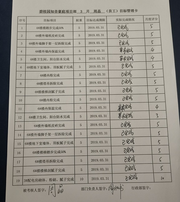 目前,集團實施的項目績效考核制度是今年2月份修訂完善后發(fā)布的,該制度新增了垂直管理環(huán)節(jié),將項目部相關(guān)崗位納入集團統(tǒng)一管理,同時通過《員工目標管理卡》將項目月度目標分解到每位項目人員頭上,使項目人員更加深刻的明確自身崗位職責(zé),從而真正實現(xiàn)目標責(zé)任到人。