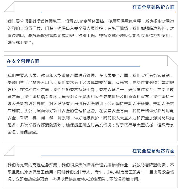 抓工程技術(shù),必須一絲不茍;抓工程進(jìn)度,必須一天不讓;抓工程質(zhì)量,必須一點(diǎn)情面不講;抓工程安全,必須一刻也不放松。這四個(gè)必須是集團(tuán)公司精益求精、鑄造精品的法寶。未來,集團(tuán)公司將繼續(xù)將安全作為警鐘紅線,將品質(zhì)作為立業(yè)之本,全力做好每一個(gè)工程項(xiàng)目!
