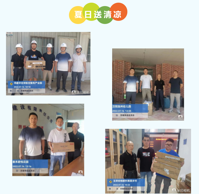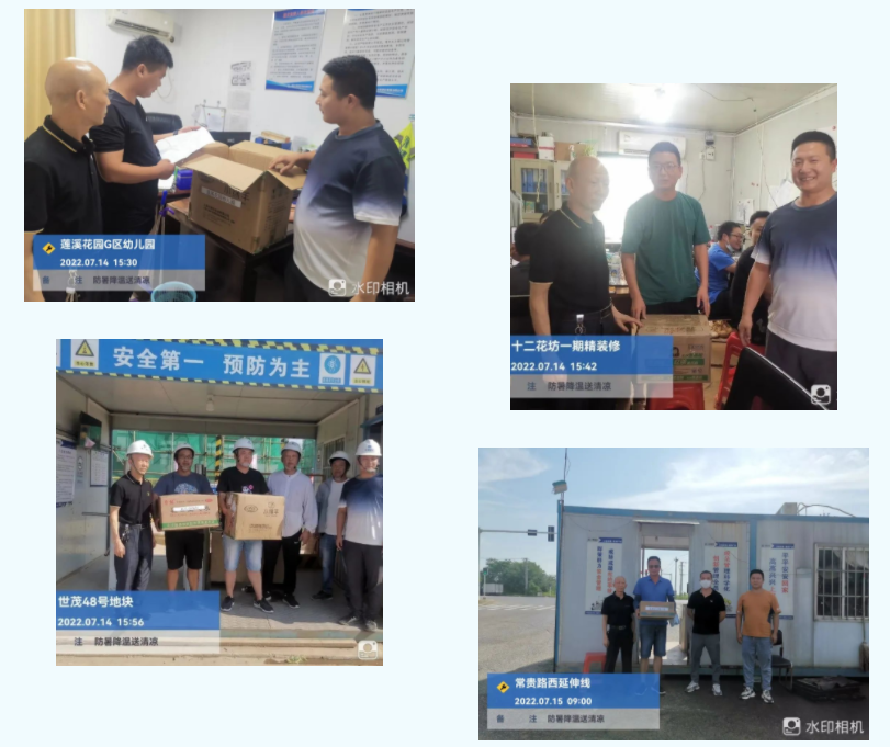 為確保各項(xiàng)目部工作順利開展,保障員工的身體健康和安全,集團(tuán)工程部及時(shí)為各項(xiàng)目送去了十滴水、風(fēng)油精、藿香正氣水、人丹、毛巾等防暑降溫物資,并強(qiáng)調(diào)高溫天氣各項(xiàng)目要合理調(diào)整作業(yè)時(shí)間,避開高溫時(shí)段,分段錯(cuò)時(shí)施工,同時(shí)管理人員要密切關(guān)注工人身體狀況,防患于未然,確保高溫季節(jié)安全施工。