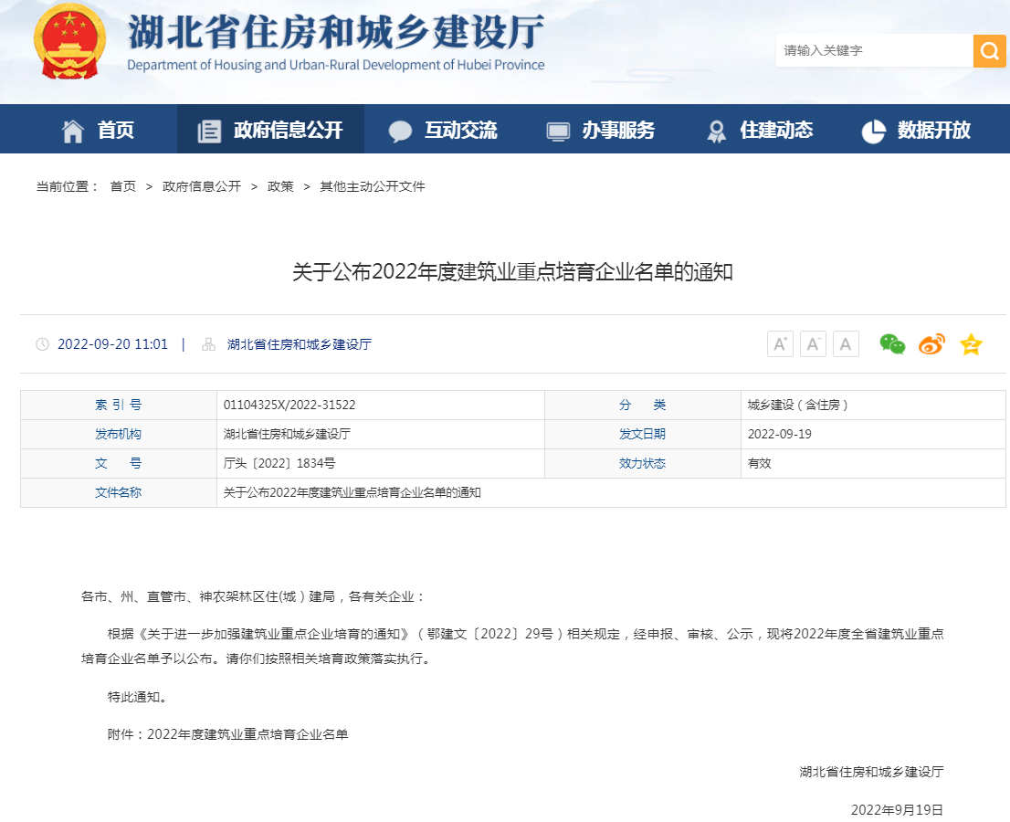 9月20日,湖北省住房和城鄉(xiāng)建設(shè)廳網(wǎng)正式公布湖北省2022年度建筑業(yè)重點培育企業(yè)名單,湖北大集建設(shè)集團成功入選!