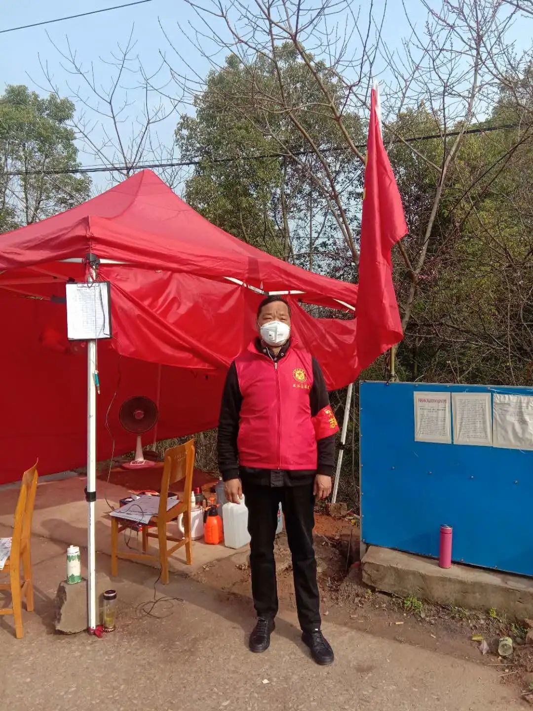 一個(gè)紅馬甲,一個(gè)紅袖章,一個(gè)口罩,57歲的集團(tuán)公司副總經(jīng)理徐家富作為志愿者已經(jīng)在這個(gè)平凡的小卡點(diǎn)堅(jiān)持了許多天。在這里,他也與武漢市數(shù)萬名志愿者一樣,做著平凡但重要的工作,檢查進(jìn)出人員、車輛的通行手續(xù),測量體溫,配合村里分發(fā)搬運(yùn)物資,為百姓搭建起安全的防護(hù)通道和物資運(yùn)送通道。簡陋的卡點(diǎn)帳篷里除了消毒防護(hù)用品外,取暖的器材只有一個(gè)電烤扇,而武漢的氣溫僅在這一周,上下跳躍的平均溫差就超過十幾度,而這一切距離他剛剛做過的膽部大型手術(shù)僅僅過去了半年。