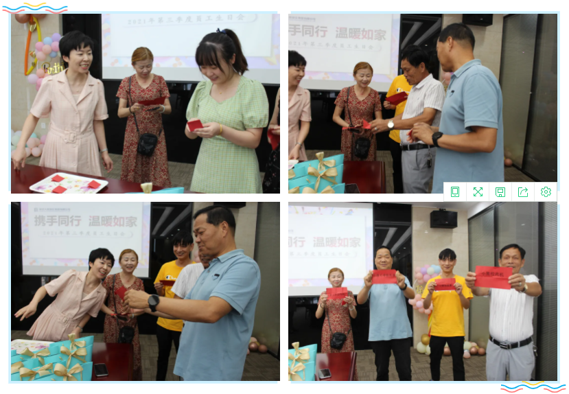九月,秋高氣爽,碩果累累,秋日的微風(fēng)和陽光是如此的美好。成長不期而遇,生日如約而至。在精心布置的會(huì)議室里,輕快的音樂聲相隨,大屏幕上播放著美好的生日祝福,集團(tuán)公司為第三季度生日的員工舉辦了小小的生日Party。氣球、生日蛋糕、禮物、精致月餅、琳瑯滿目的零食飲品,每一處溫馨的細(xì)節(jié),都承載著公司對(duì)員工的愛與關(guān)懷。
